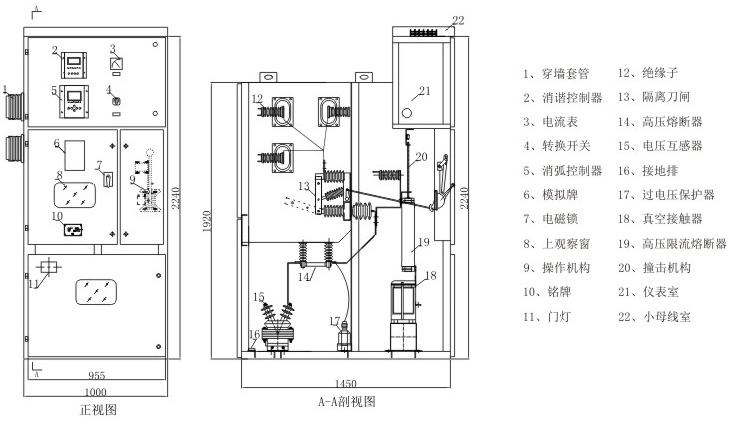 消弧柜為固定式開關柜,外形尺寸可根據用戶要求加工,消弧柜結構如裝罝結構圖所示。對6kv、10kv的柜體,考慮用戶檢修方便,寬度般不小于800mm,對于35kv柜體,寬度般不小于1800mm,深度